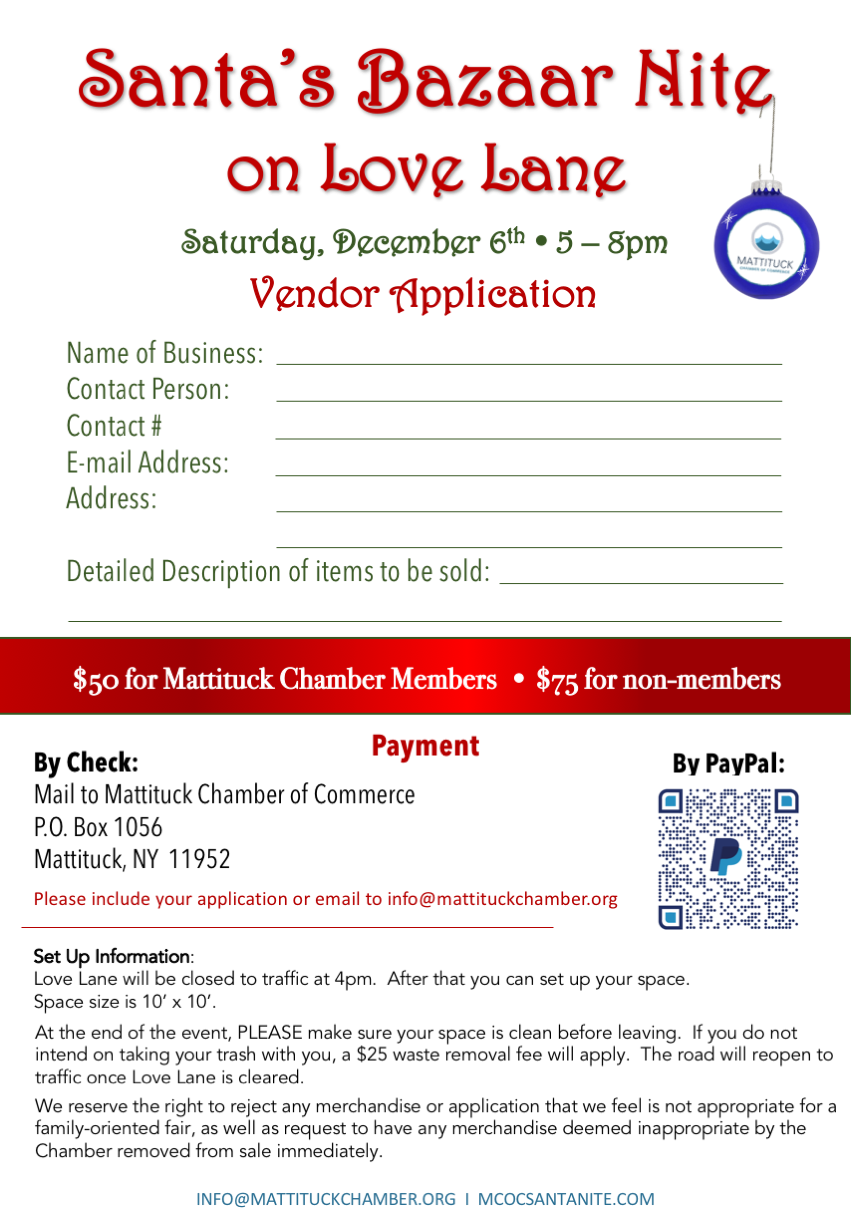 To download the application, click the link below and send it back to info@mattituckchamber.org. Payment can be made via PayPal on this site.